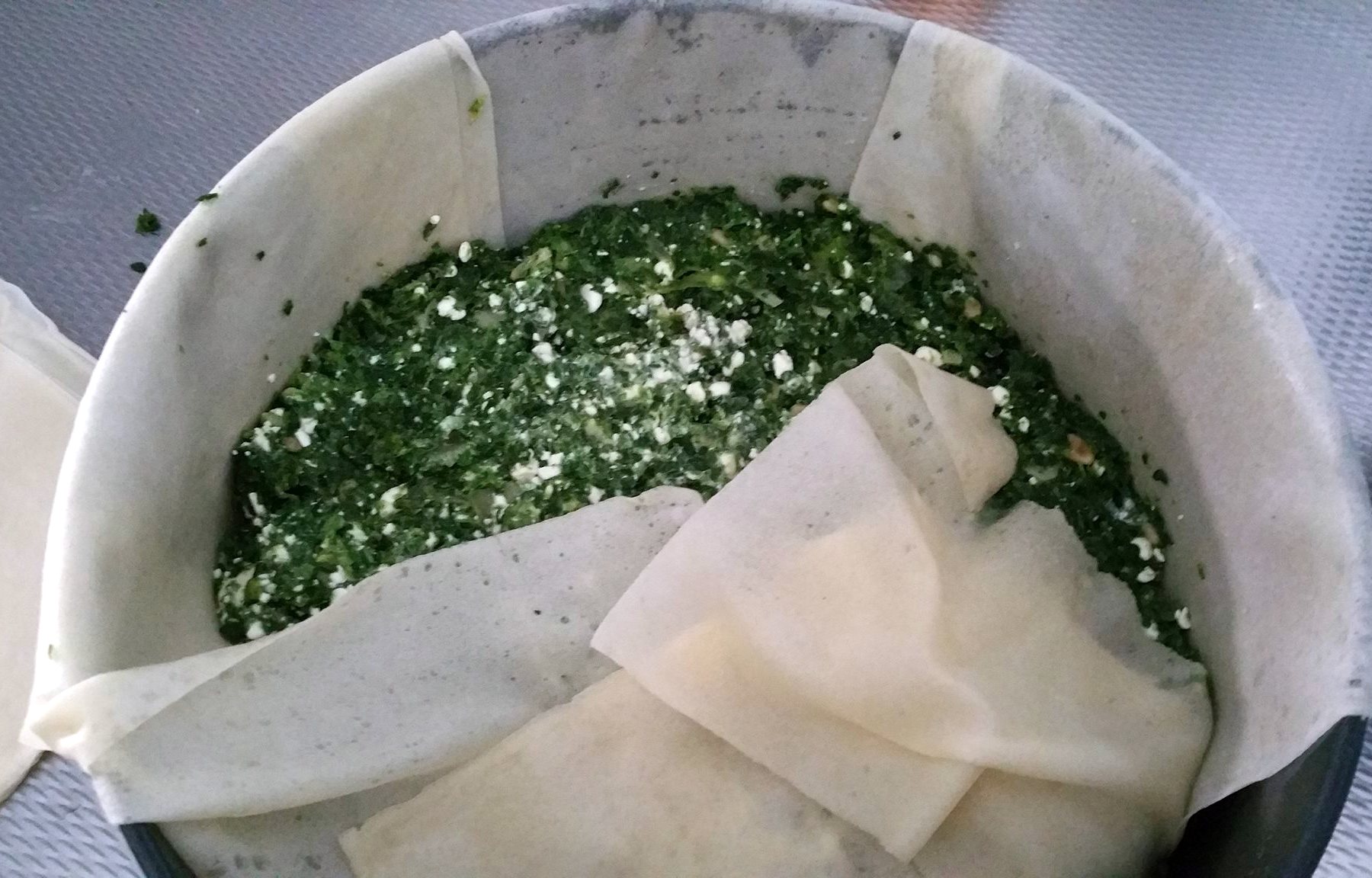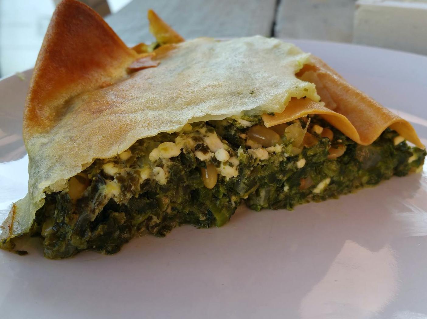 Spanakopita is een Griekse vegetarische taart met spinazie en kaas.
