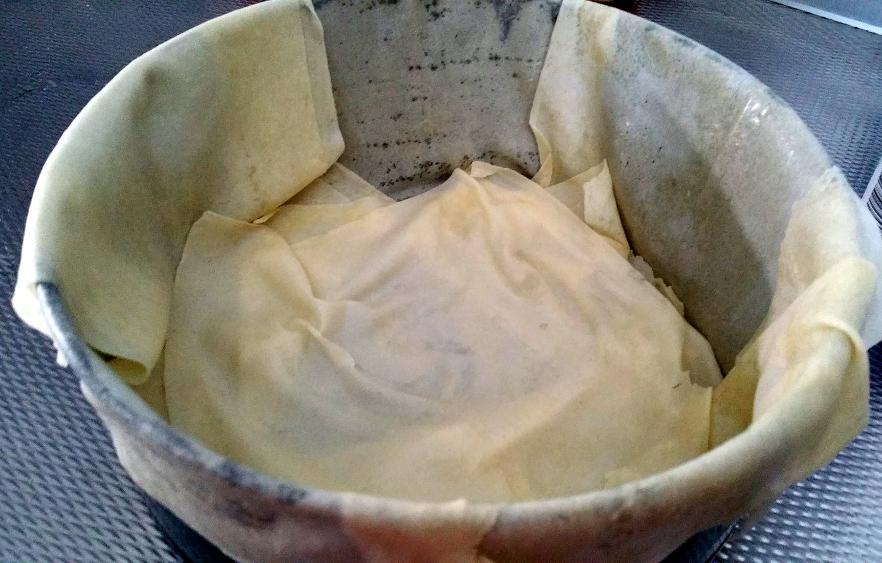 Strijk een vel filodeeg met de gesmolten boter en leg het op de bodem van de vorm en doe dat tot de bodem vol is. Laat ze aan de zijkant hangen, zo kun je straks de vellen over de spinazie klappen.