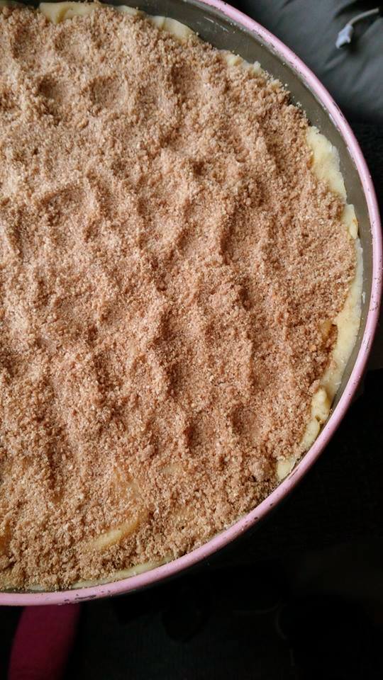 Verdeel als laatste het kruimeldeeg op de appels.