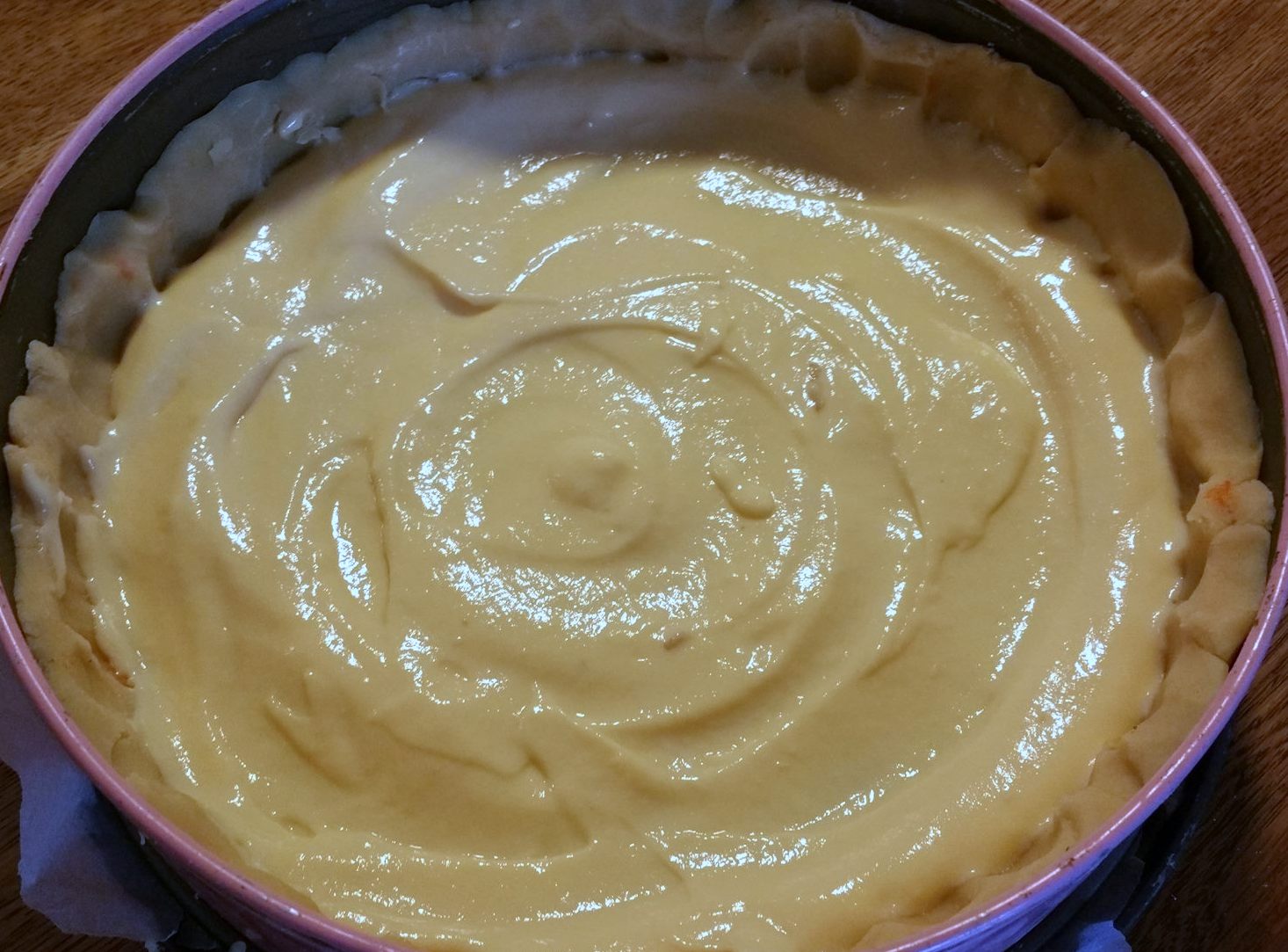 Verdeel de crème patissiere op het deeg.