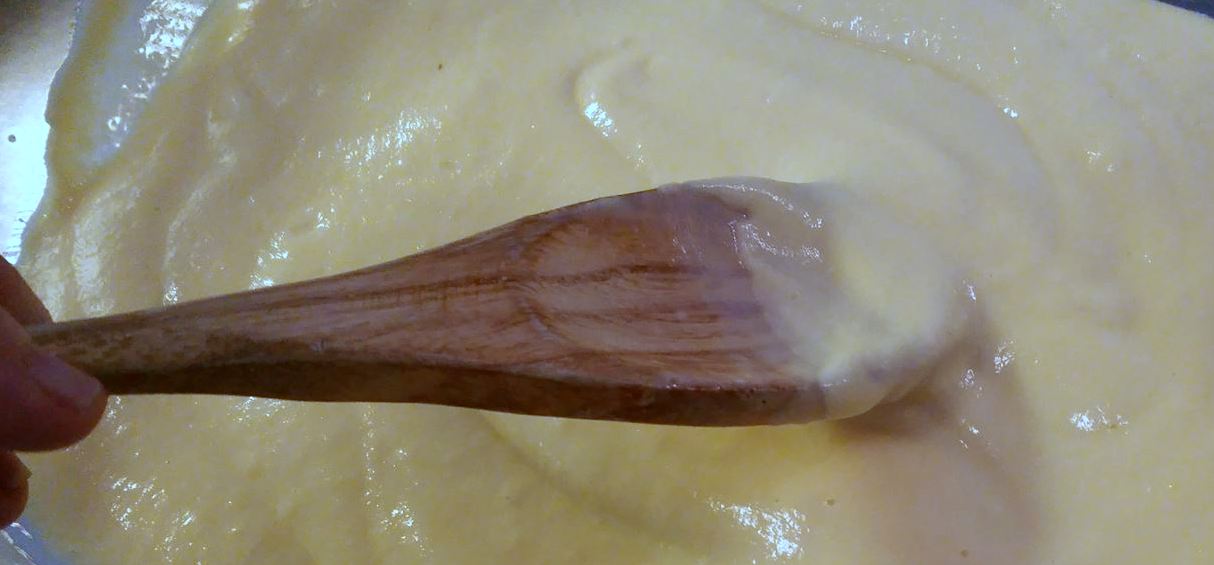 Voeg de warme melk al roerend toe, goed roeren (met een hout lepel), anders ontstaan er klonten.
