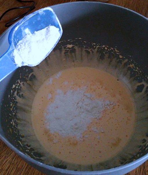 Voeg de bloem toe aan het ei-suiker mengsel en meng dit glad.