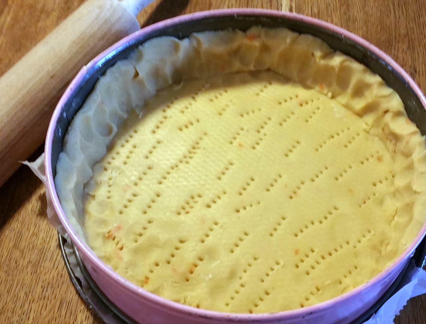 Rol het deeg uit tot een grote lap en bekleedt de vorm hiermee.