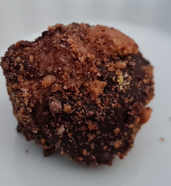 Strooi wat geraspte chocolade en wat speculaas kruimel.