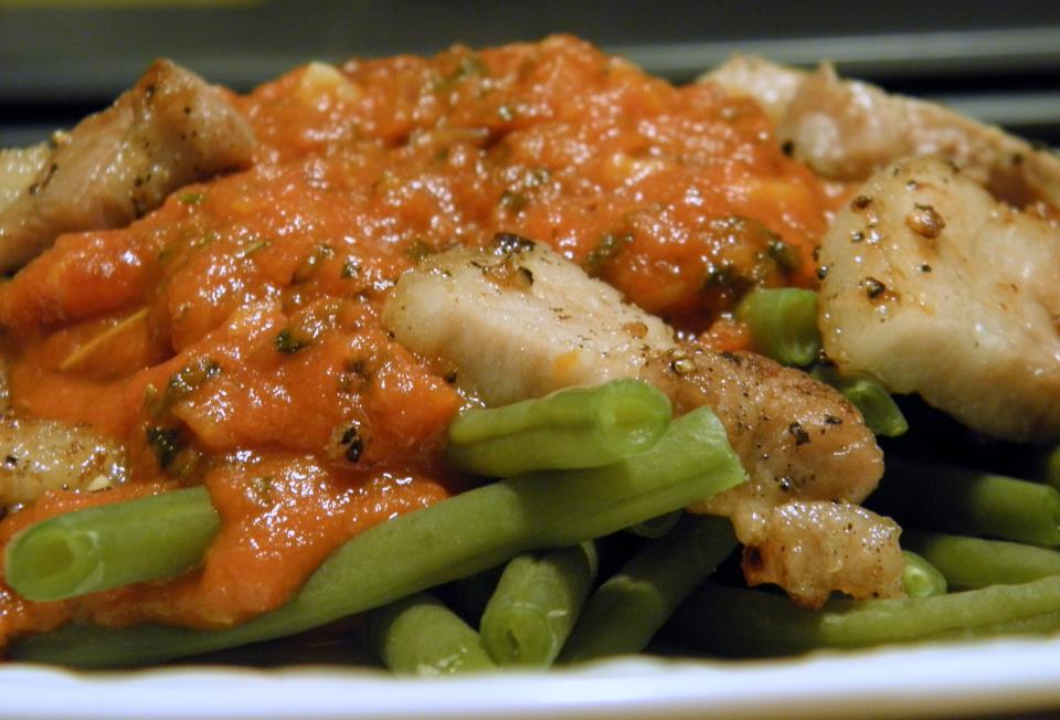 Mijn moeder maakt sperziebonen in tomatensaus.