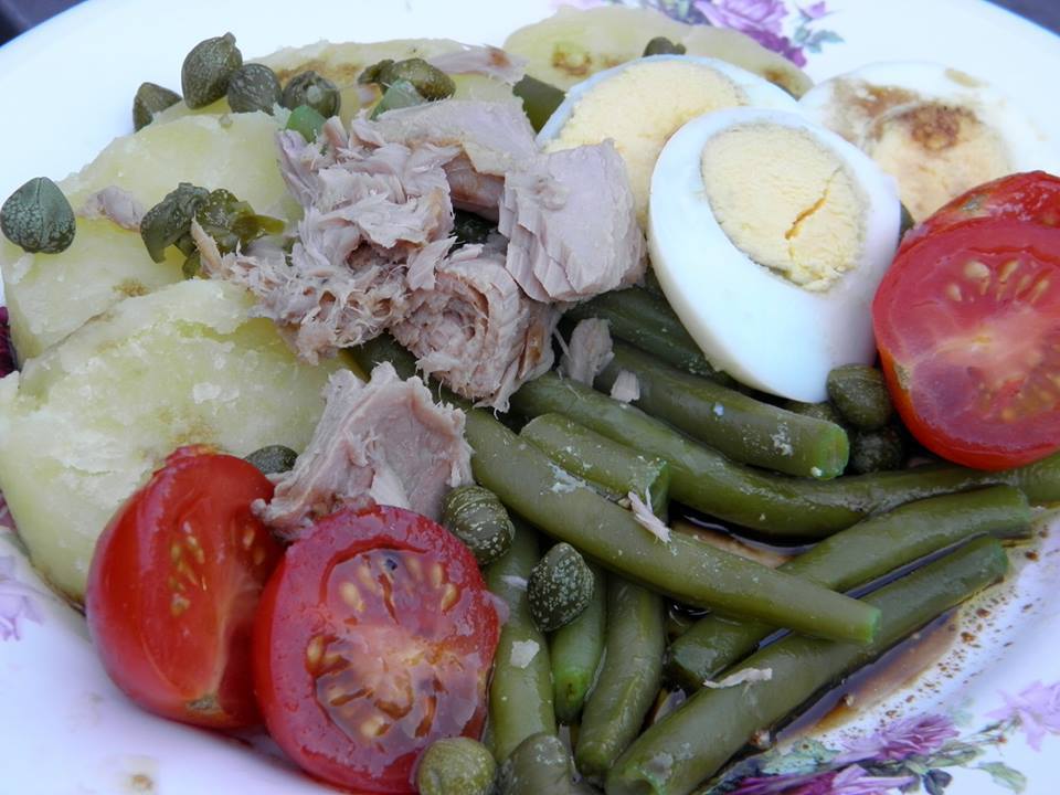 Je kun de avond van tevoren, de eieren, de aardappelen en de sperziebonen koken en ze, tot de volgende dag, in de koelkast zetten.