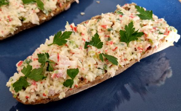 Deze surimi salade is ideaal om te serveren op toast of brood.