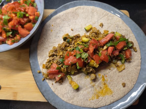 Serveer het gehakt mengsel in een schaal, de tomaten in een kom, eventuele saus in een andere kom en de wraps op een bord.