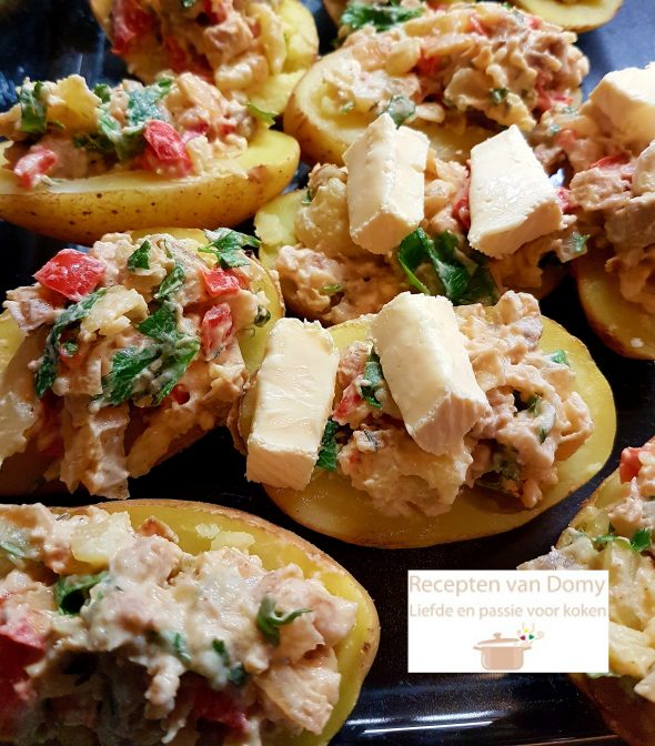Hol de aardappelen en zet ze naast elkaar in een ovenschaal (bewaar de binnenkant).