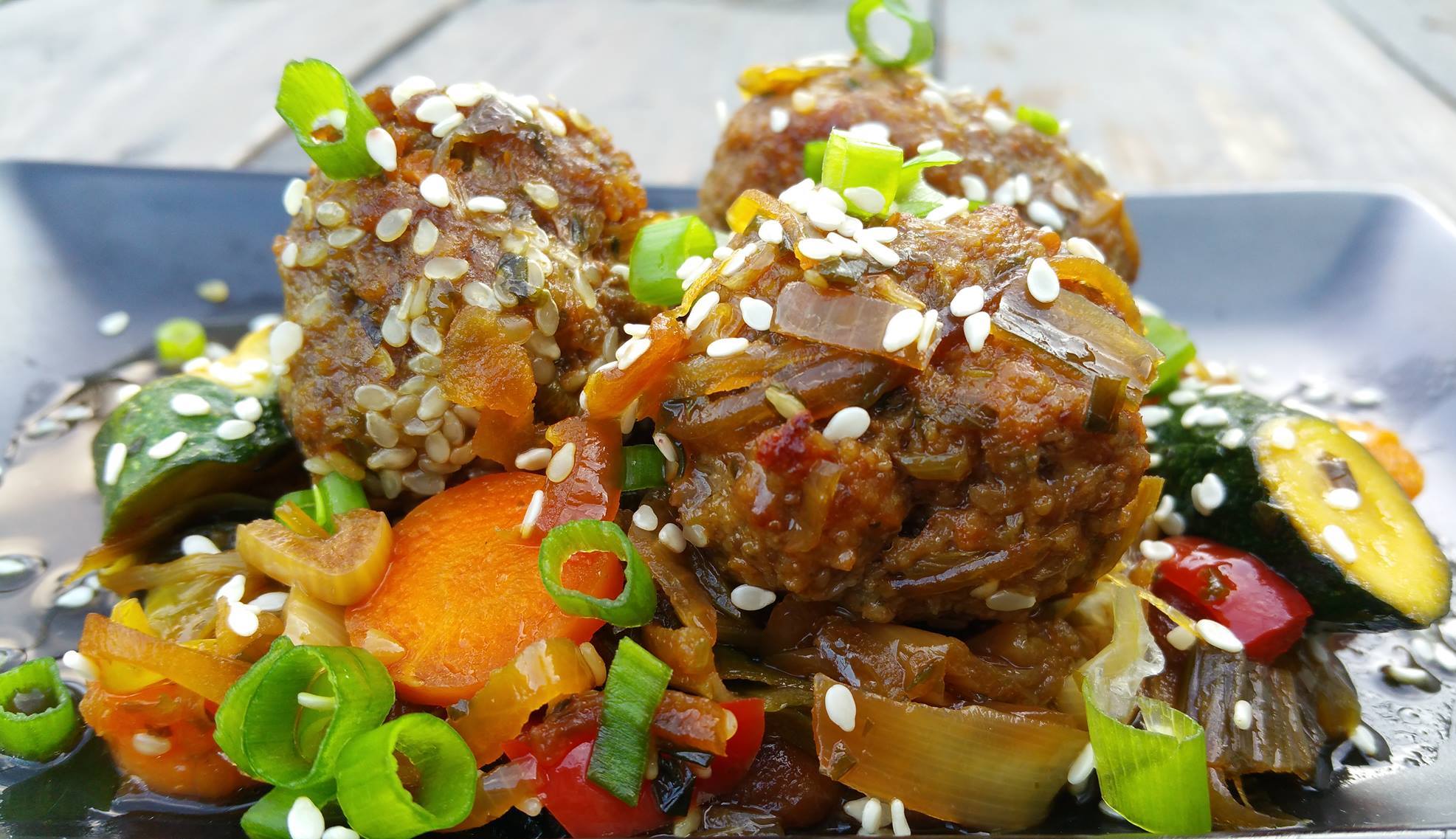 Zelf verzonnen recept van gekruide balletjes, groenten in de wok in een lekkere zoet-zuur saus.