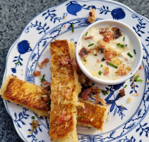 Strooi wat bieslook erop en serveer meteen.(Hier had ik een mix van panko, spekjes, gebakken sjalotjes en bieslook gedaan).