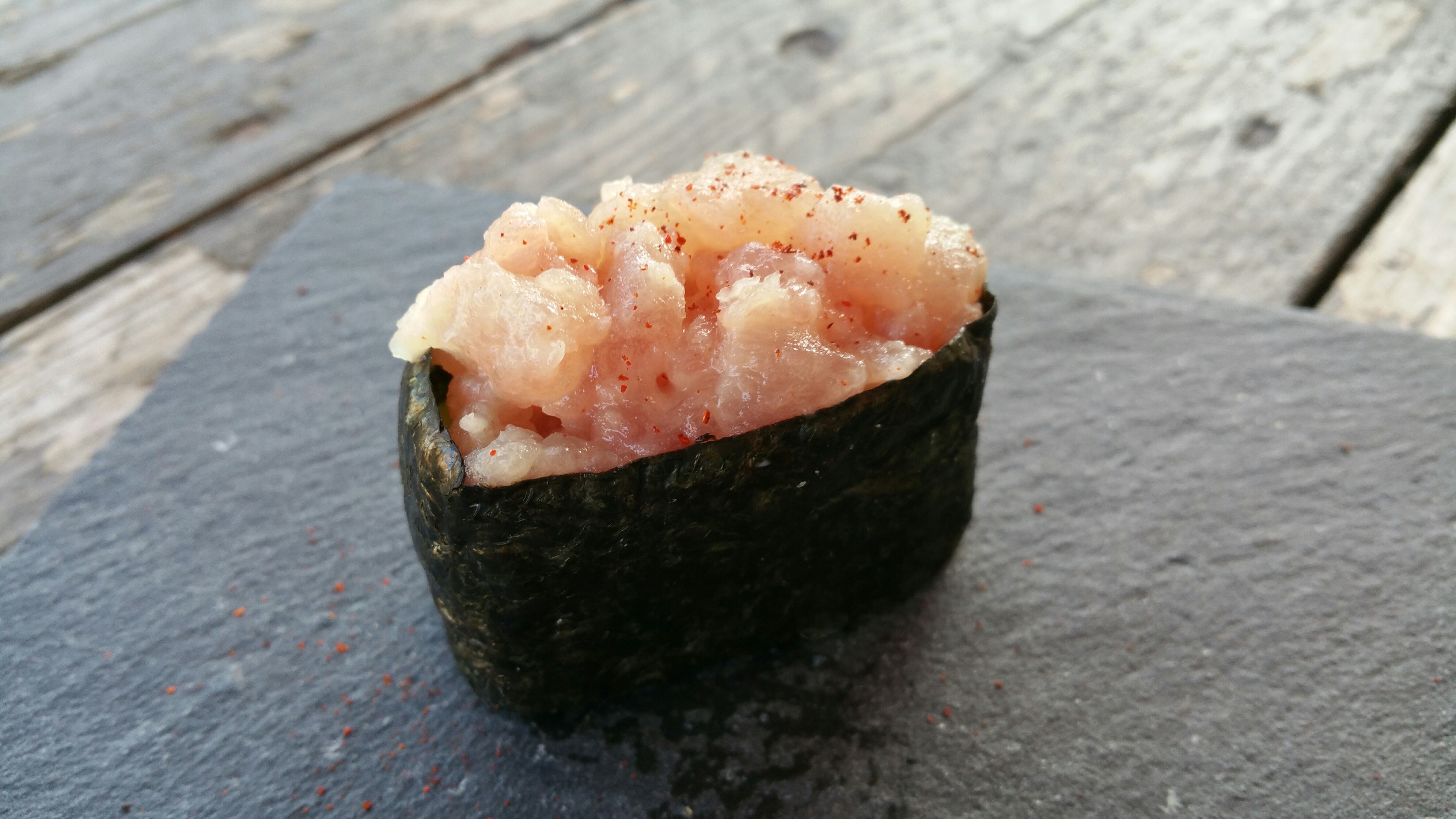 Vul de Gunkan sushi’s met mini blokjes tonijn en wasabi mayonaise.