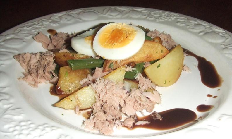 Meng de bonen met de gebakken aardappelen, de ui, de peterselie, de muntblaadjes en de dressing.
