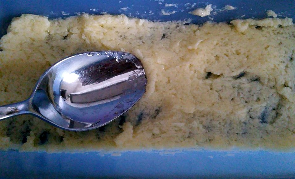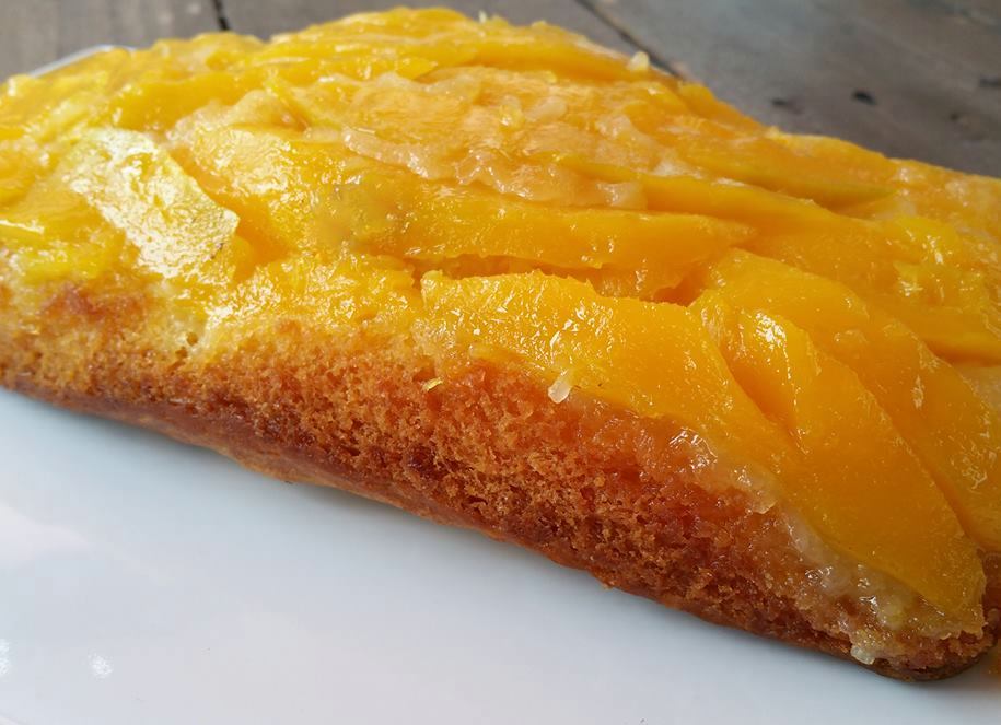 Door de boter met suiker onder de bakvorm, komt een laag die de mango niet mee bakt. De mango blijft zo lekker vers.