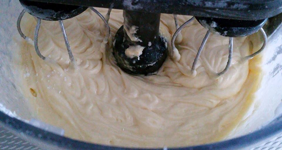 Voeg de bakpoeder, de vanille suiker en de bloem en klop het deeg tot een mooi glad beslag.