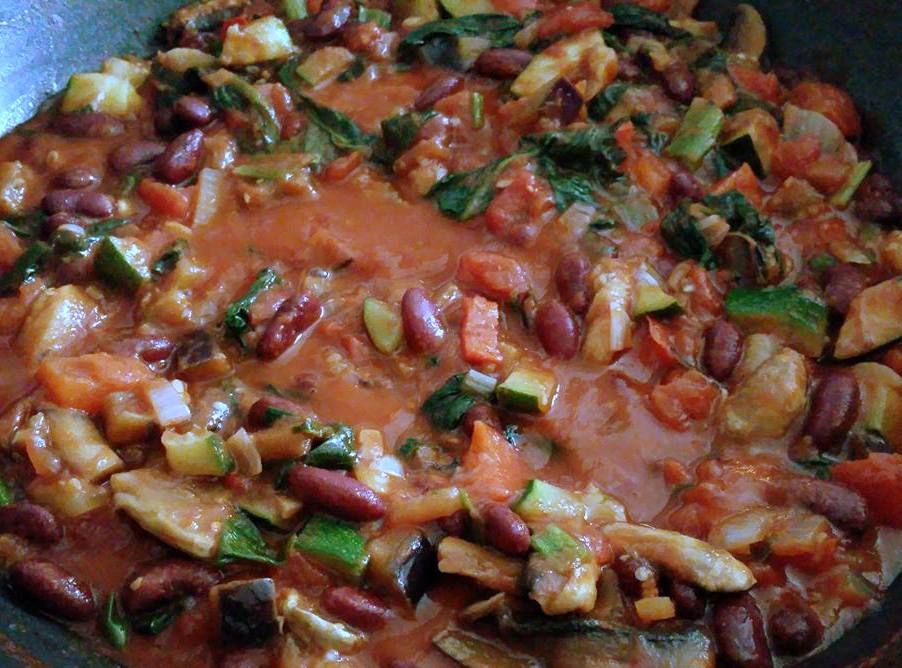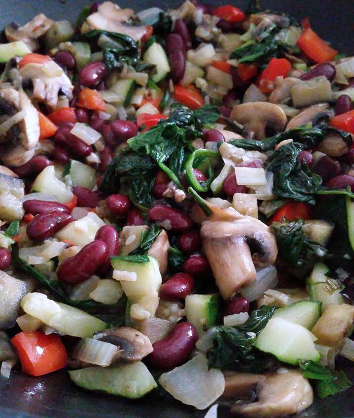 Voeg de courgette, de aubergine, de champignons, de lente uitjes, de paprika en de peper toe en bak nog een paar minuten.