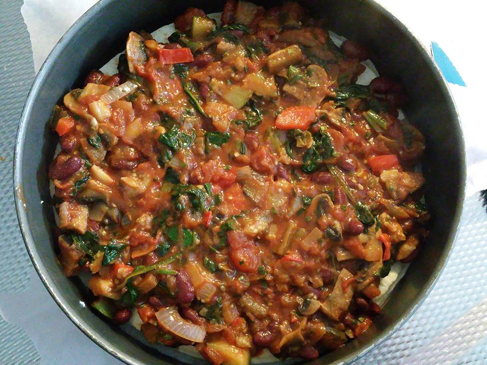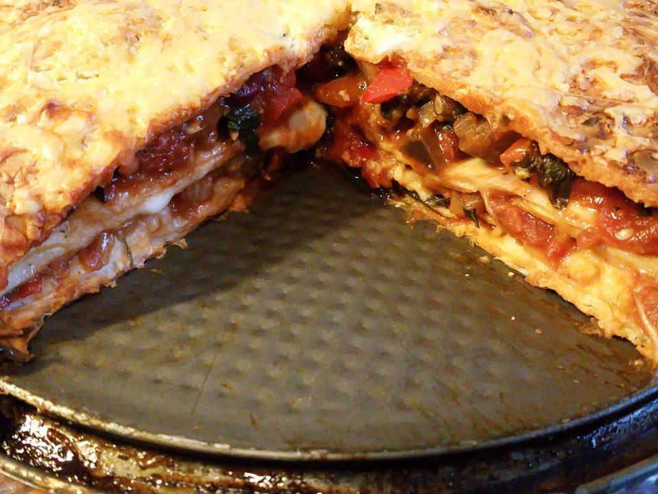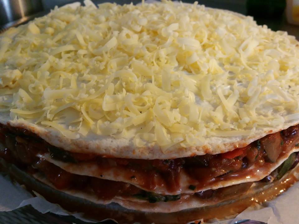 Die vegetarische Taart is gemaakt met lagen tortilla, groenten in tomatensaus en met mozzarella met een Mexicaanse accent.