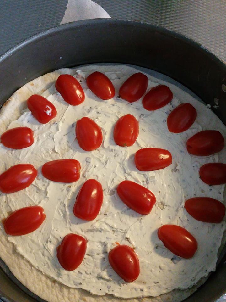 Smeer wat smeerkaas erop en verdeel een paar Cherrytomaten bovenop.