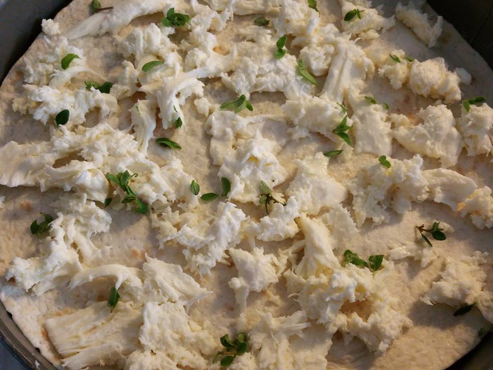 Zet In een springvorm een bakpapier vel en zet de 1e tortilla erop.