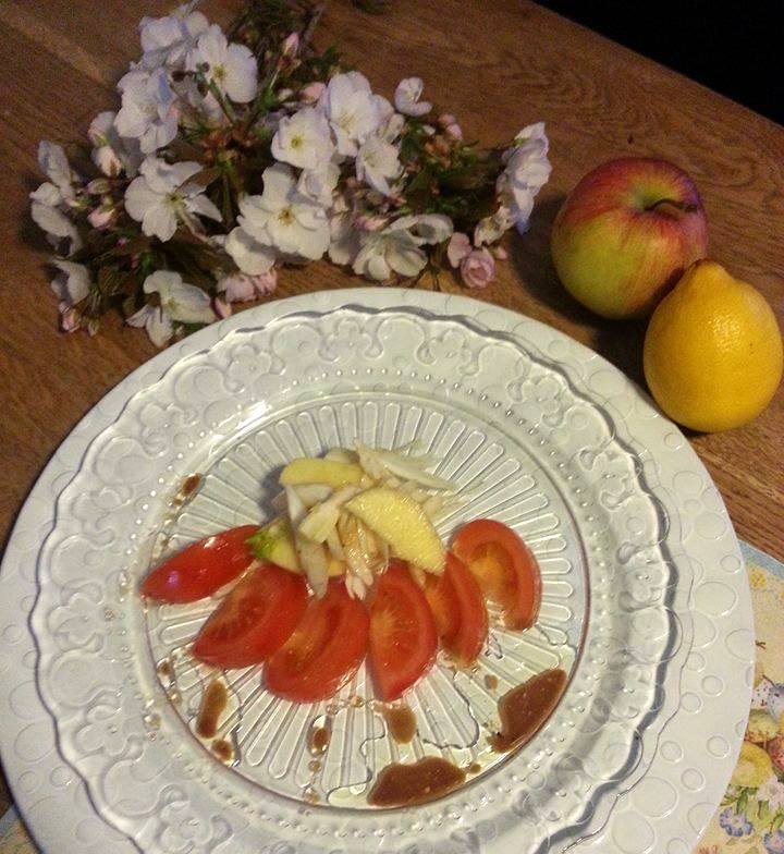 Meng de venkel samen met de tomaten en de appels in een kom.