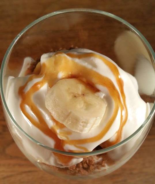 Maak de verrine door lagen koekjes, banaan, Dulce de Leche en slagroom.