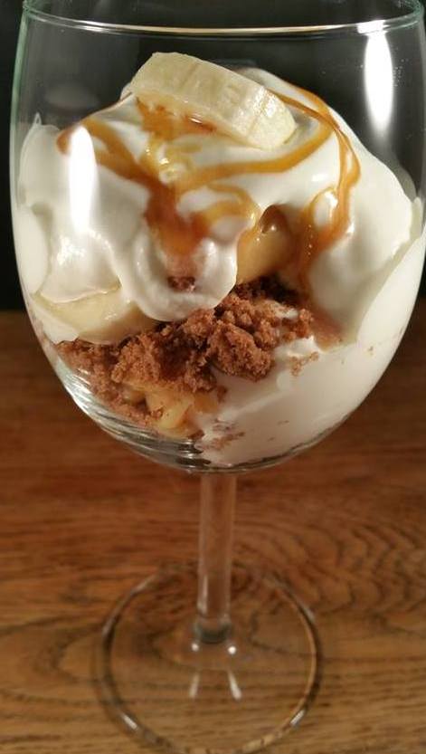 Garneer met caramel saus, een plakje banaan of met koekjes.