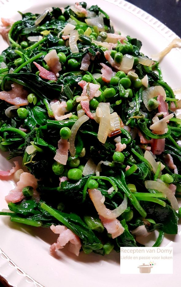 Heerlijk recept van verse spinazie, bacon en doperwten in de wok.