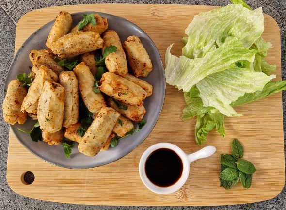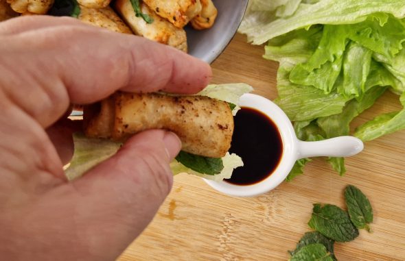 Serveer meteen met sla blaadjes, zoete soja saus in een bakje ernaast en verse munt blaadjes.