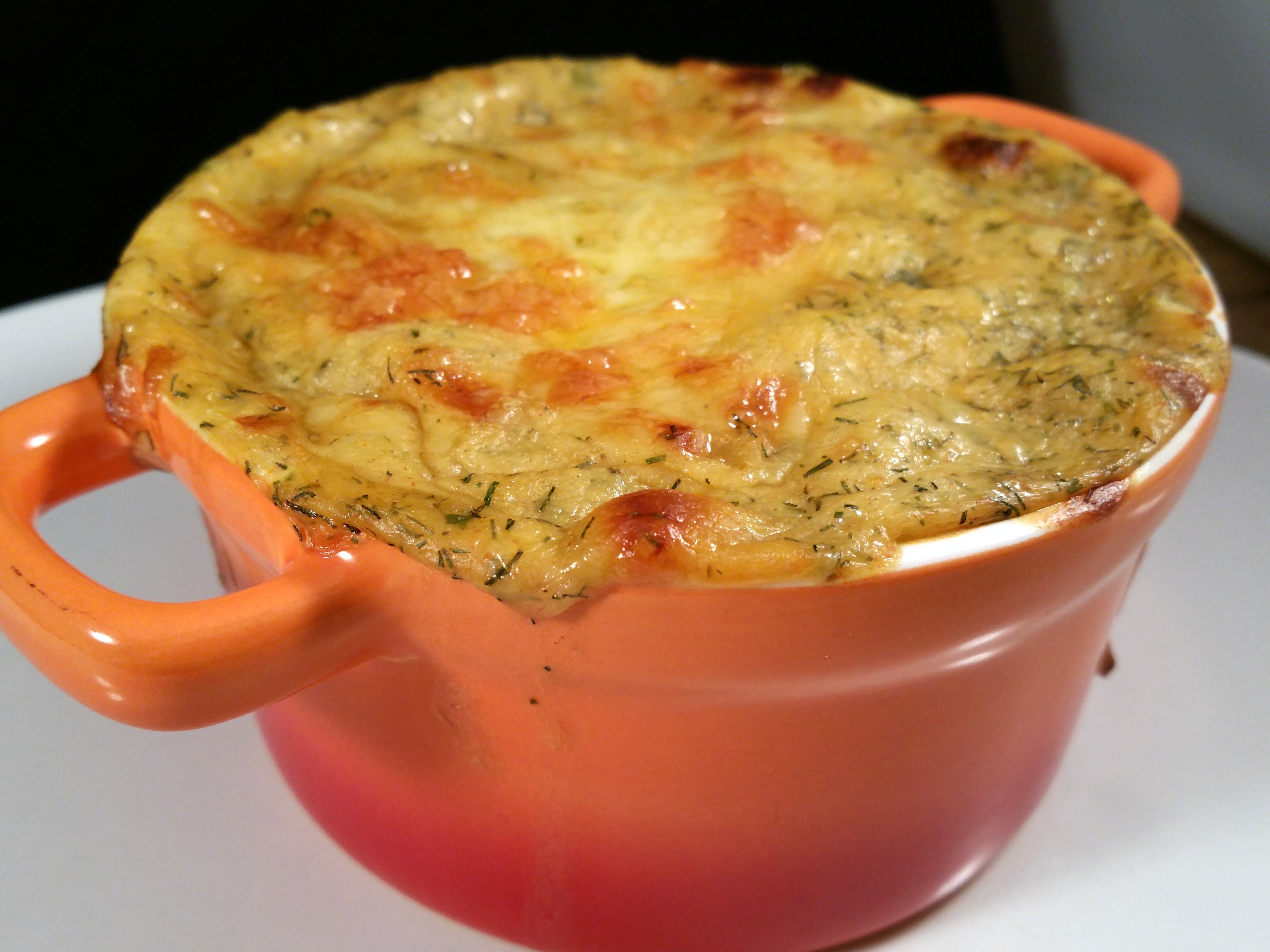 Verdeel de saus in pannetjes, strooi wat geraspte kaas eroverheen.