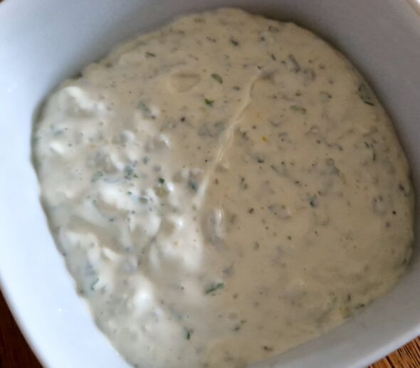 Meng de mayonaise met de Griekse yoghurt. Hak al de verse kruiden en de augurken fijn.