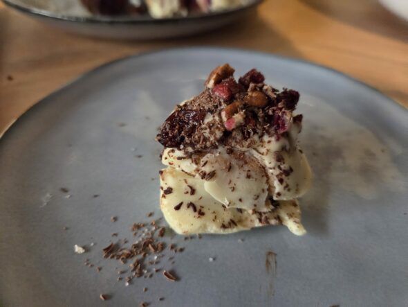 Meng in een kom de Philadelphia, cakekruimels, cranberry’s, pecannoten, frambozen en eventueel honing tot een smeuïge massa.