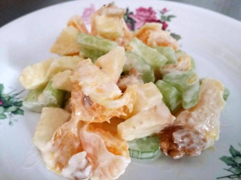Meng de appel, de sinaasappel, de ananas, de walnoten en de bleekselderij met de dressing.