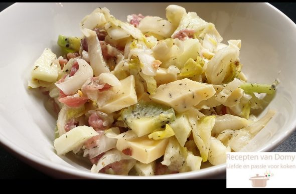 Meng de dressing met de witlof en zet de salade, 30 minuten in de koelkast.