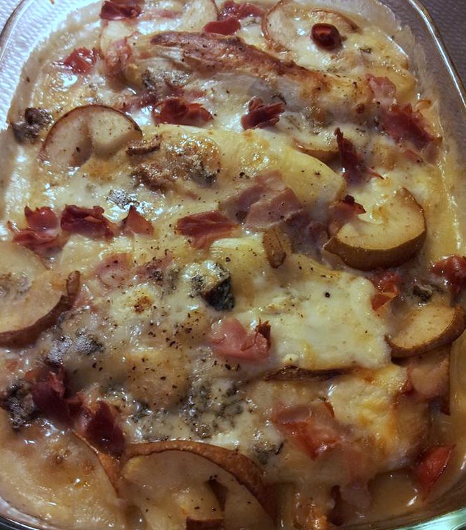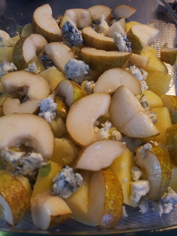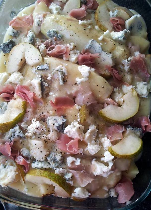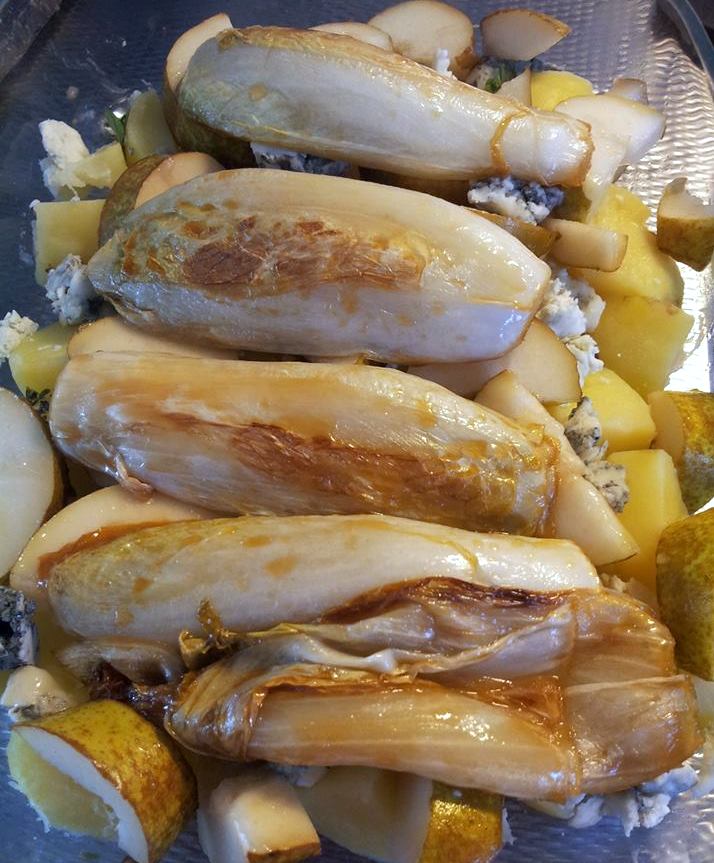 Verdeel de plakken peer over de aardappelen, verdeel de helft van de gorgonzola en verdeel daarover de gebakken witlof.