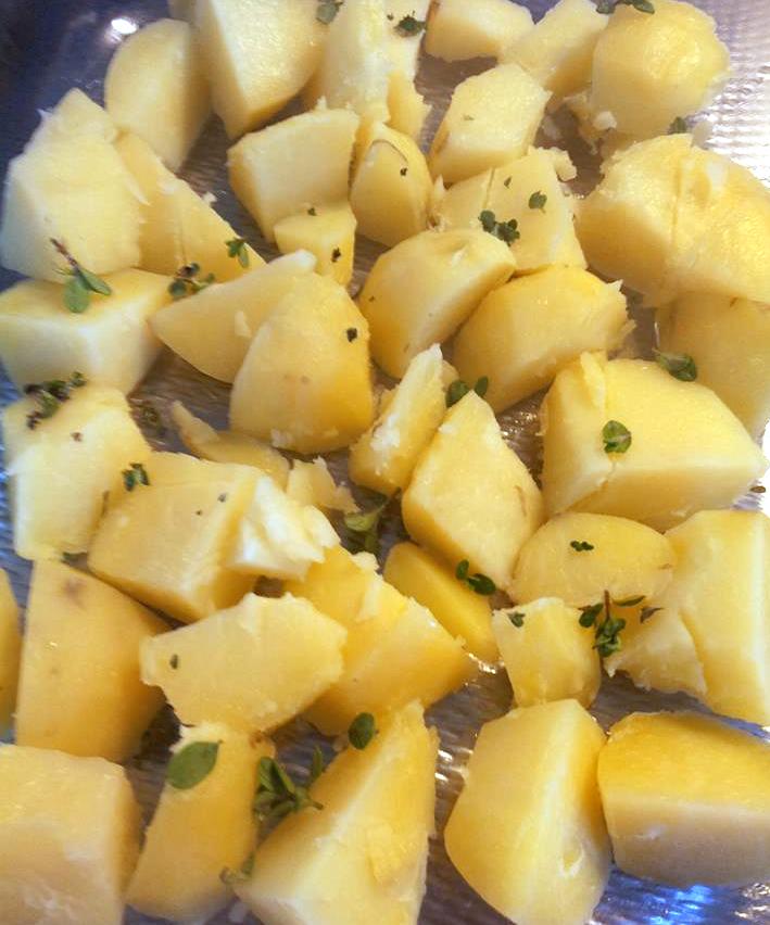 Verdeel de aardappelen blokjes over een ovenschaal.