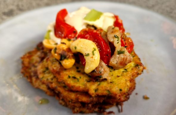 Heerlijke gebakken geraspte groenten, geserveerd met een lekkere topping en een frisse citroen-kwark saus. Natuurlijk, kunnen de speklappen reepjes kunnen weg voor een vegetarisch gerecht.
