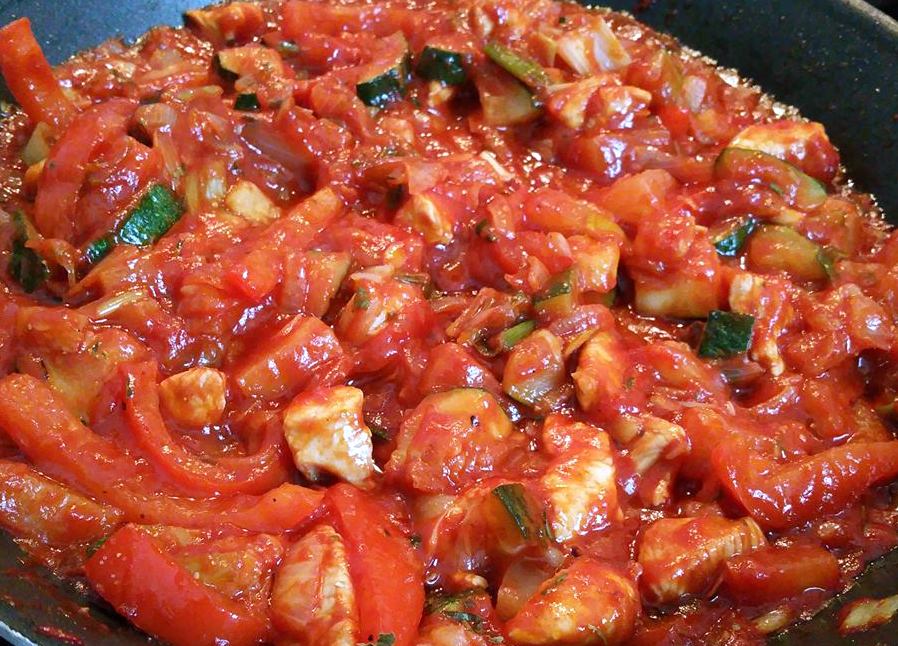 Voeg de paprika, de peterselie en de courgette toe en bak nog 3 minuten.