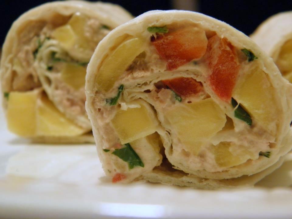 Bestrijk wat tonijnsalade op de wraps, leg er daarboven een beetje mango en rol de wraps op.