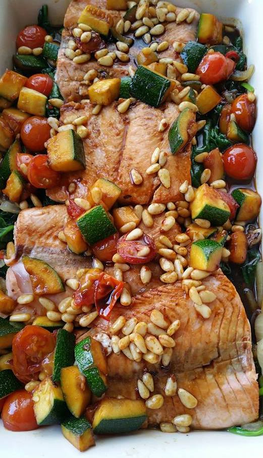 Verdeel het courgette-mengsel op de zalm (met vocht) en strooi de pijnboompitten erover.