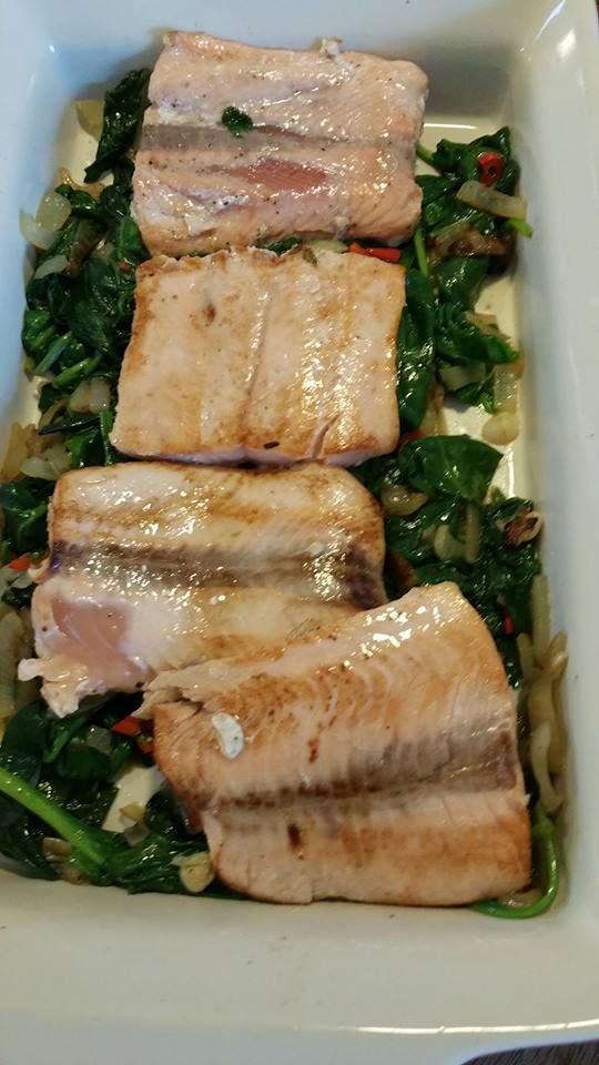 Zet de zalmfilets naast elkaar op de spinazie.