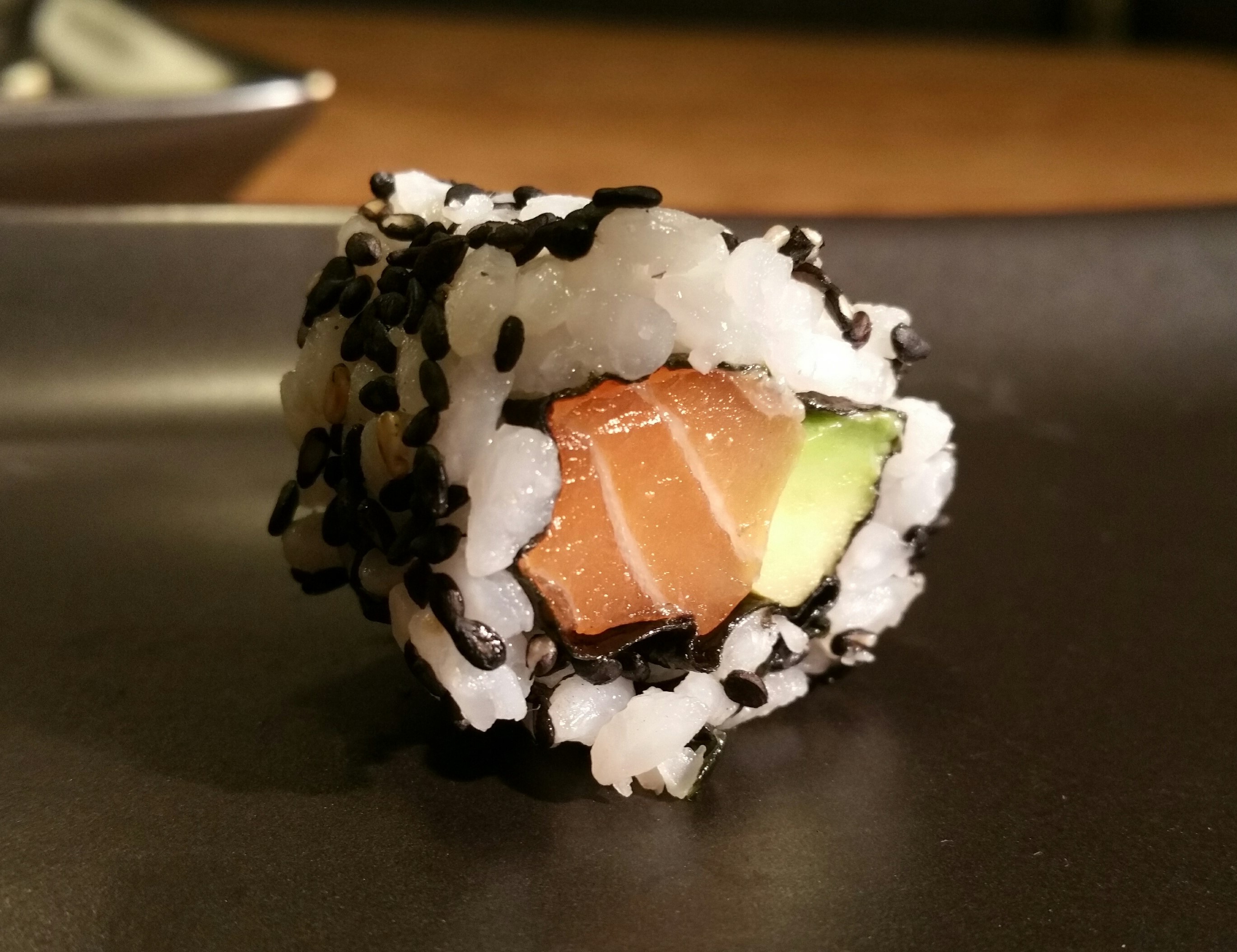 Leg een stuk huishoudfolie er op en draai dan alles om zodat de folie en de rijst op het bamboematje komen te liggen. Je legt dan een stukje zalm en een stukje avocado en wat wasabi mayonaise op het nori vel en rolt de sushirol strak.