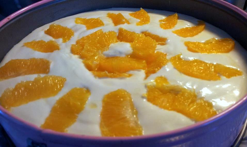 Snijd de sinaasappels in partjes en gebruik ze om de kwarktaart te decoreren.