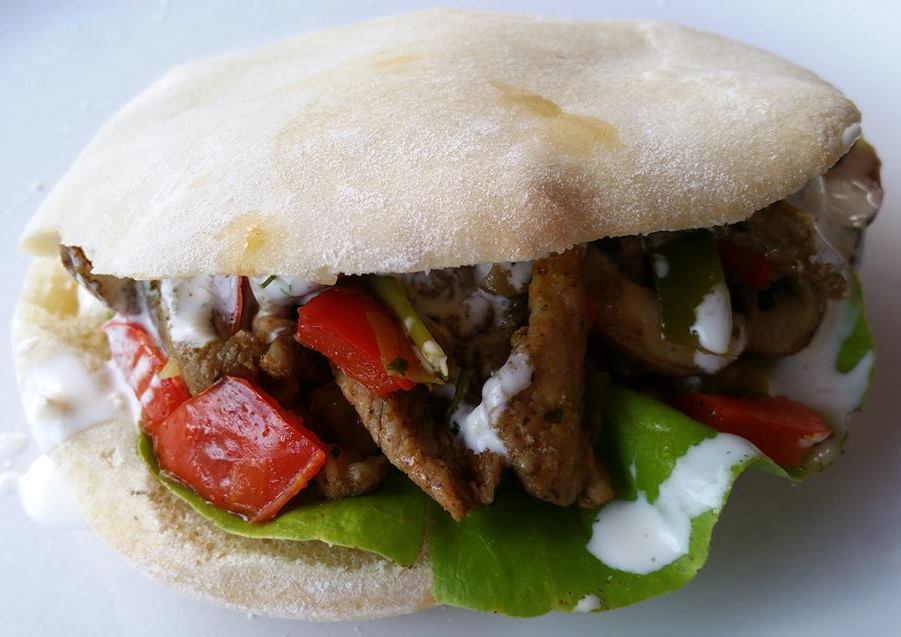 Snijd de pitabroodjes (maar niet helemaal) en vul ze met groenten, vlees en zelfgemaakte knoflooksaus.