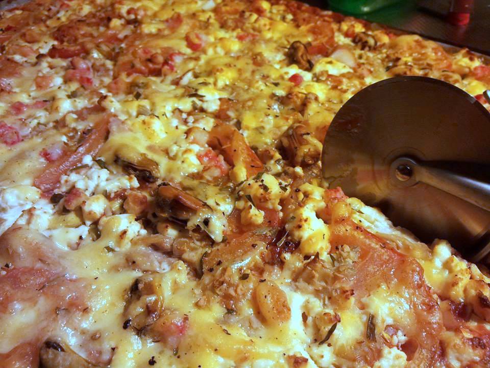 Verdeel de vis, de zeevruchten, de tomaten, de uien over de pizza.