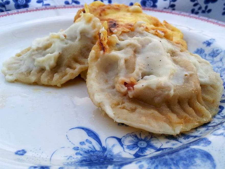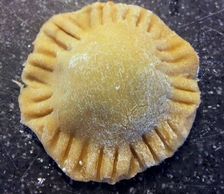 Leg de 2e cirkel bovenop en druk de ravioli dicht door met een vork de randjes plat te drukken.