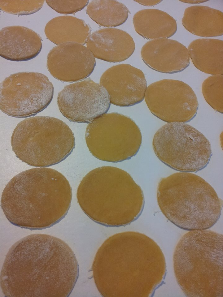 Met behulp van een borrel glaasje, maak cirkels, 2 per ravioli.