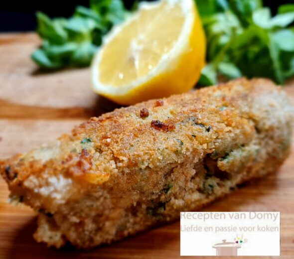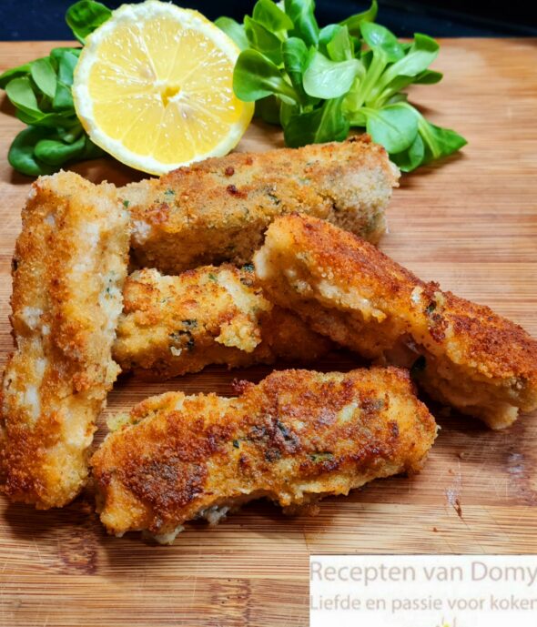 Dop de vissticks eerst in de bloem, draai ze erin, dan in de omelet en dan draai ze in het paneermeel.