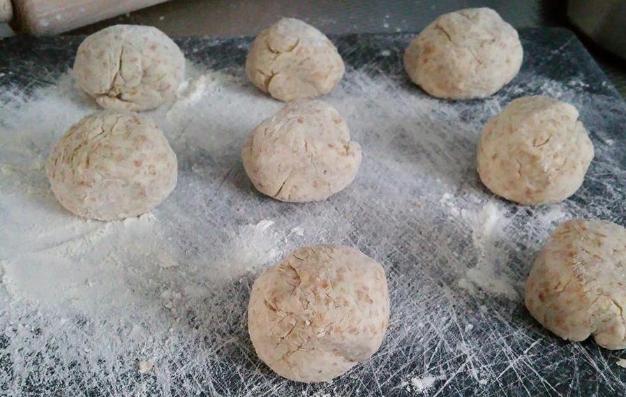 Zodra het deeg klaar is om te gebruiken verdeel je het in zes even grote bolletjes die je plat slaat en uitrolt met een deegroller.