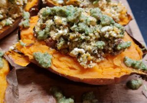 Vul de half aardappelen met het chorizo mengsel en verdeel de pesto erop.
