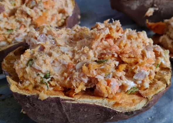 Meng het vruchtvlees samen met het tonijn mengsel.